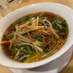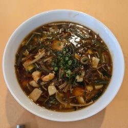 月曜日の12時35分に到着、入店。月曜日は定休日だがこの日は営業中。複数人だったため円卓に通される。メニューを見てから標題を口頭注文。少々時間がかかって着丼。スープは酸っぱさと辣油の辛さがじんわりときて全体にとろみがある。酸味は黒酢使用なので奥深い味わいで茸類の旨みもだいぶ加わっている。麺は中太で極端に短い縮れたタイプでラーメン店ではあまり見かけない。中華料理店の麺料理でのみ使... 続きを見る