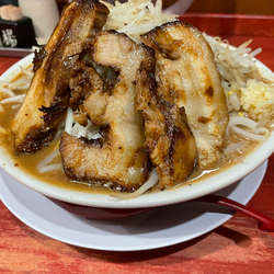 麺固め200gニンニクヤサイマシ脂少なめを注文、見た目は二郎系インスパイアですが、麺もスープも二郎とは少し違う感じかな?麺は太麺ですが二郎の麺より細めでワシワシと言うよりツルツルな麺で二郎初心者には食べ易いと思います。肉は1枚から3枚まで無料トッピングです。