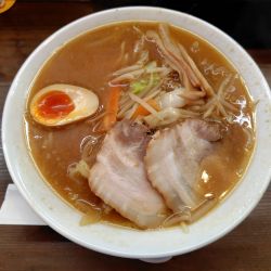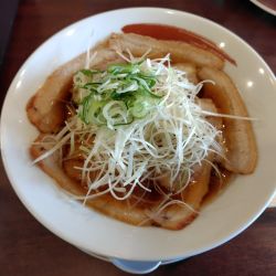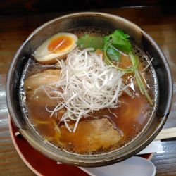 豚肩?チャーシュー2、輪切り白ネギ、メンマ、煮卵半分、味付け白髪ネギ