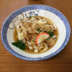 麺量は100gくらい、油揚げ、鰹節、ホウレンソウに蒲鉾でいたってシンプル。