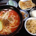 女性店員さんに店外のホワイトボードに手書きで書かれていたランチメニューから刀削担々麺セット+餃子・チャーハン780円を注文。