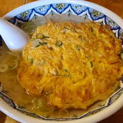【注文】海老玉ラーメン・刀切麺(1090円)+半餃子(240円)。これは2/23に提供を開始した季節メニュー。最初は豚玉ラーメンにするつもりだったが、今回はせっかくなので期間限定のこれにする。