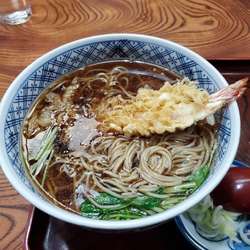 ・店の外観:昔ながらのそば屋風の外観、紫色の暖簾、メニューの立て看板。