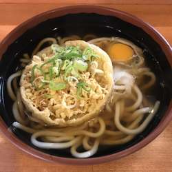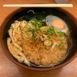 三ノ宮「松屋」の「スタミナうどん」、かき揚げにワカメ、生たまご。早くて安くて美味い。