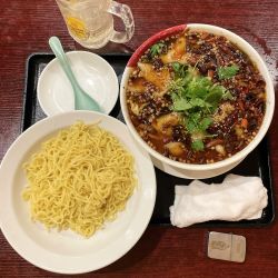 【注文】麻辣刀削麺・辛め(950円)。このメニューは唐辛子マークが3本付いている。更に辛さ増しが出来るようなので「辛め」オプション(無料)も追加する。注文はタブレットから実施。... 続きを見る