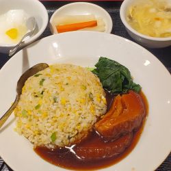 【注文】ランチ5・豚バラ肉の角煮チャーハン(990円)。久々にここの豚バラ角煮が食べたくなったので注文する。