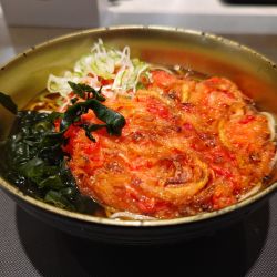 トッピングは牛肉、揚げ玉、ねぎ、わかめ。