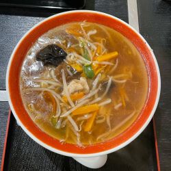 具は、もやし・ピーマン・キクラゲ・にんじん・豚肉。ピーマンの苦味がスープに滲み出てしまっているのは苦手なタイプ。