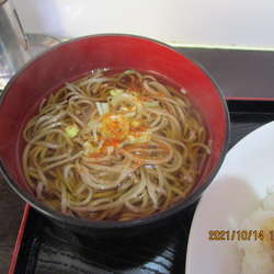 ミニかけそばにライスに生姜焼きとお新香です。