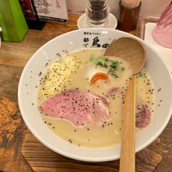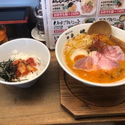 14時すぎ、行列1に付いて20分程で着席。鶏白湯+ラー油=じんわりくる辛さ。クリーミーな白湯スープと香ばしいラー油の風味が共存。緩い平打ち形状の中太ストレート麺が合う。底のほうには唐辛子片、変化があっていい。全体的には優しい刺激の一杯。