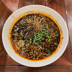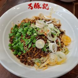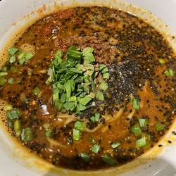 細い平打ち麺の上に、たくさんのひき肉が入った餡(あん)が鎮座し、ワケギ、刻みネギがトッピングされていました。麺と餡を手早く、丹念に混ぜ、まずは一口いただきました。辛い!というよりもピリ辛でした。ゴマの風味はあまり感じられませんでしたが、多少の痺れはありました... 続きを見る
