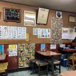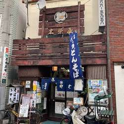 ・店の外観:木造りな外観、白い看板、藍色の暖簾、メニューの張り紙。