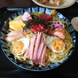 ハム、カニカマ、トマト、カマボコ、エビ、レンコン、ゆで卵、紅生姜、海苔、オレンジと多彩な具。