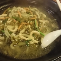 ネギチャーシュ醤油麺(968円)を。スープは、画像だと分かりづらいが醤油清湯。バランスは良いのだが、とても温い。麺は、もったりとした中太。具は、ネギ・細切りチャーシュー。ネギはどっさりと入り、細切りチャーシューは大陸系の味付け。夜の訪問でしたが、杏仁豆腐のサービス有り。女将の接客も好印象。こちらは2回目の訪問でした。