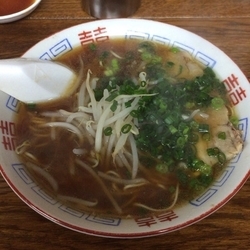 〆のラーメンでは最高に美味しいです。あっさり醤油ベース。甘く豚のコクの風味がとても良い。細ストレート、チャーシュー、もやし、ねぎ。また行きたかった。