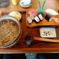 | メニュー | メニューの写真を見る ●にぎりセット(そば+にぎり3かん+巻物1本)1,000円 |