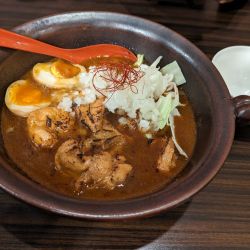 【房総式ラーメン】鶏肉をたっぷり煮込んだオリジナルラーメンは醤油、味噌、カレーから選べます(辛さ抜き〜大辛まで調整可能)麺を食べた後に残ったスープで作るおじやも是非お試し頂きたい逸品です。グツグ...続きを読む