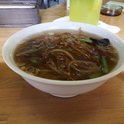 トッピングのあんは、甘めの醤油味。もやし、細切りたけのこ、細切りチャーシュー、青菜、白菜、キクラゲ、タマネギ入り。あと、長ネギが散らしてあります。